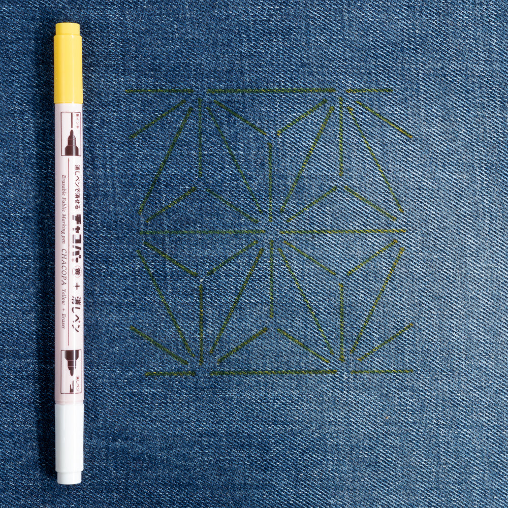The pen nib is comparable in size to the thick Clover water-erasable fabric-marking pen. Unlike the paint pen I invented in my dreams, the effect of this pen is more subtle. Photographs shown here were taken in daytime window light, but you might struggle to see yellow pen lines on denim at night under dim lighting conditions.