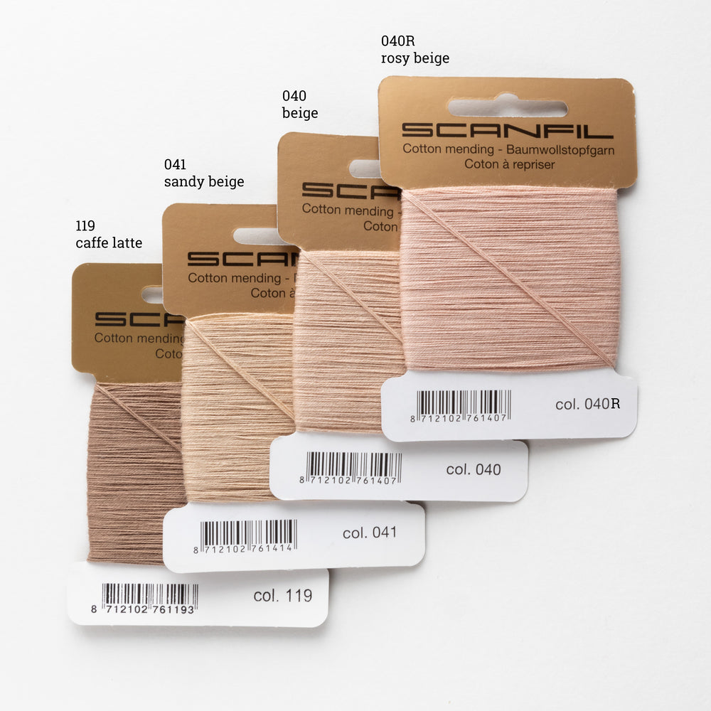 For a more colourful cotton option, try Cottage Garden Threads embroidery thread and for an organic option try Scanfil organic cotton sewing thread (for stitching only). If you need to darn wool and other animal fibres, try Mend it - limited-edition upcycled mending yarn or Scanfil mending wool. For a thick cotton option if you need to darn chunky, hand-knit clothing, I recommend using cotton knitting yarn instead (not available here; ask your knitter friends for scraps or support your local yarn shop!).